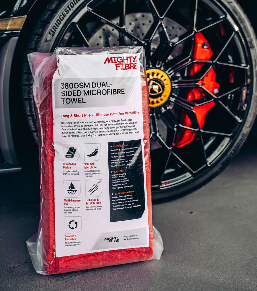 Designed for efficiency and versatility, our 380GSM Dual-Sided Microfibre Towel is an essential tool for any cleaning or detailing job. One side features plush, long fibres perfect for gentle buffing and dusting; the other has a tighter, short pile ideal for removing polish, wax, or residue. Use it dry for dusting or damp for a streak-free clean.